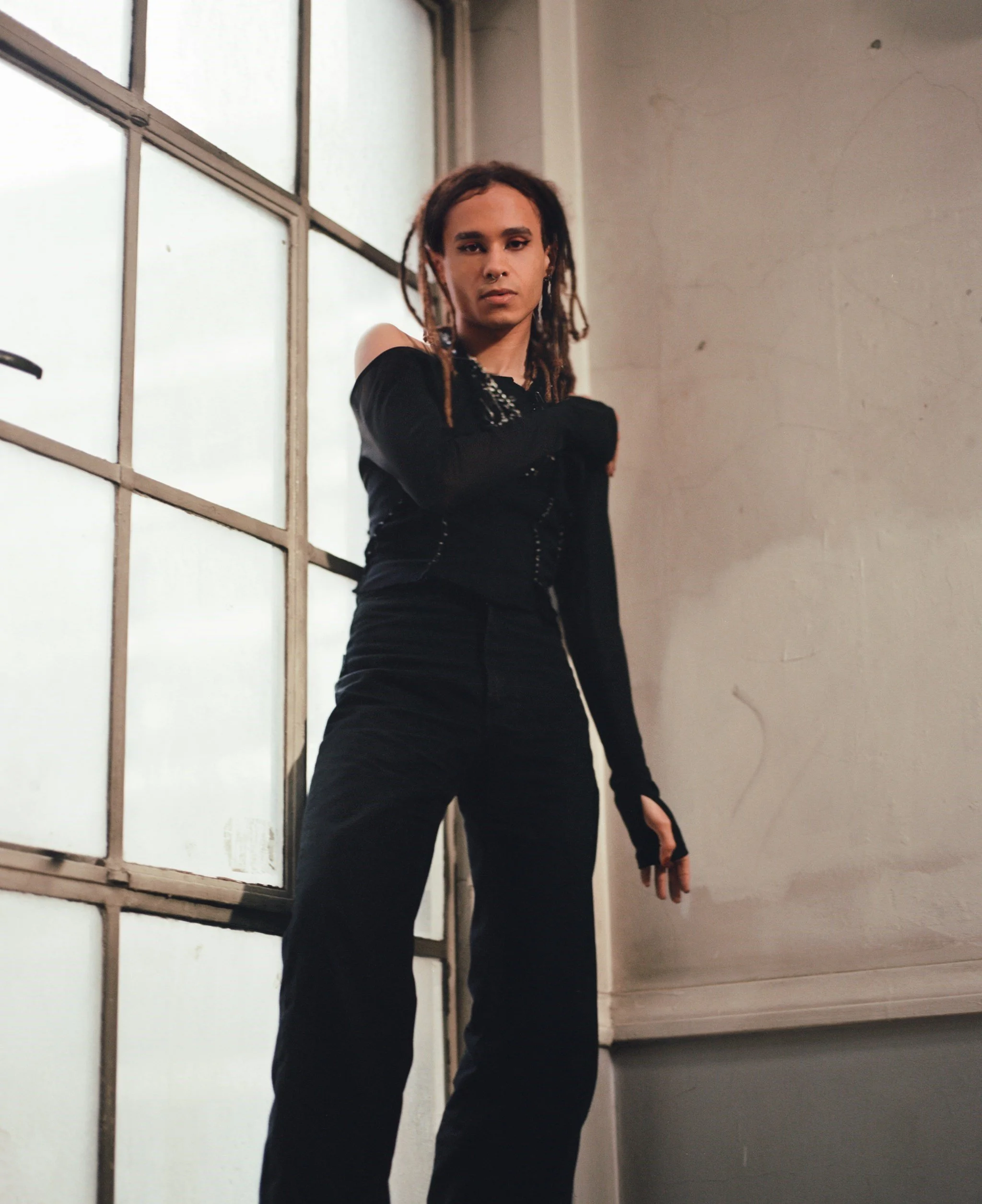 eerie and strange suture stitch top worn by Chiyo in the promotional shots for Travis Alabanza’s ‘Sound of the Underground,’ at the Royal Court Theatre. Styled by Mia Maxwell, 2023